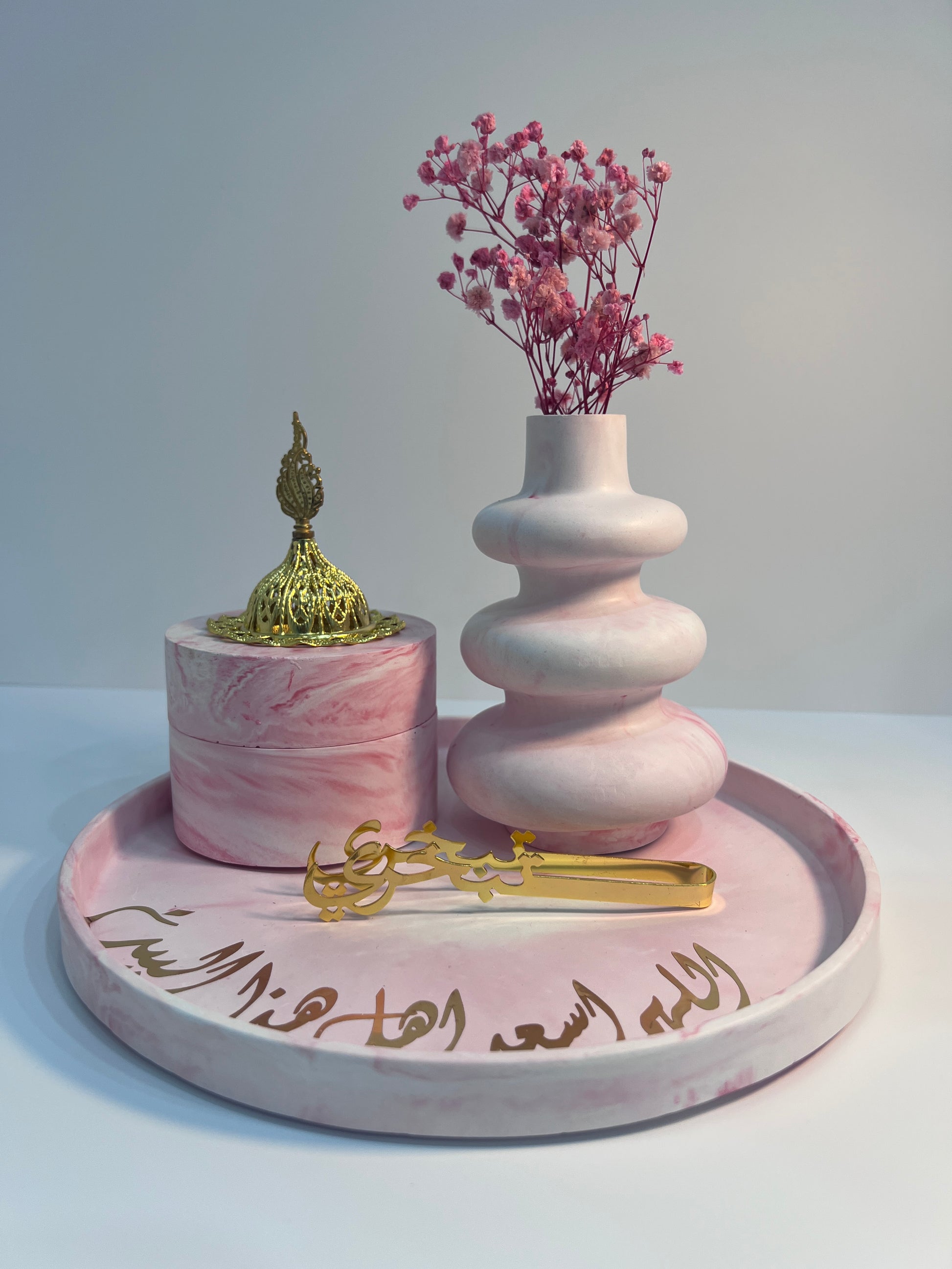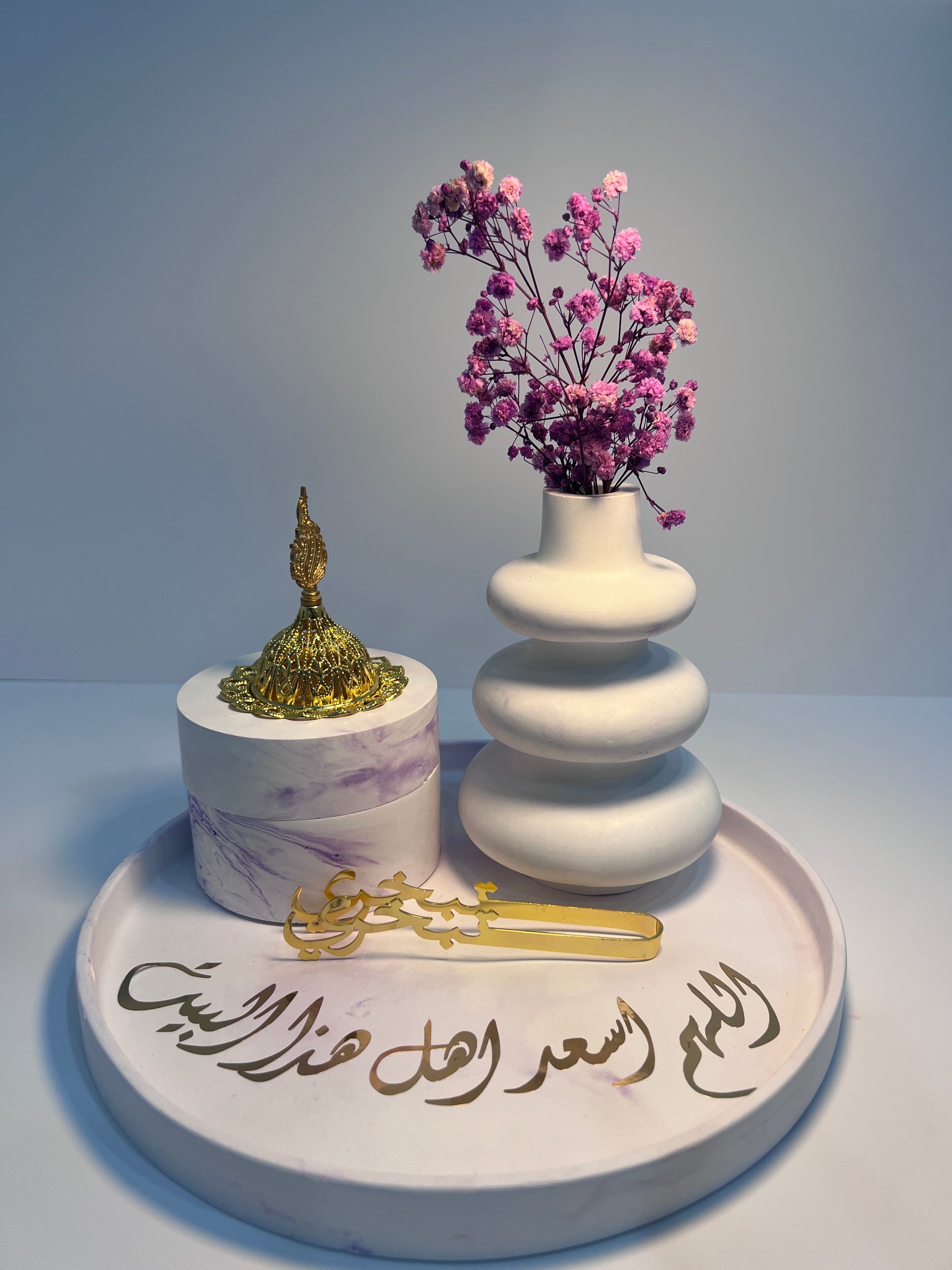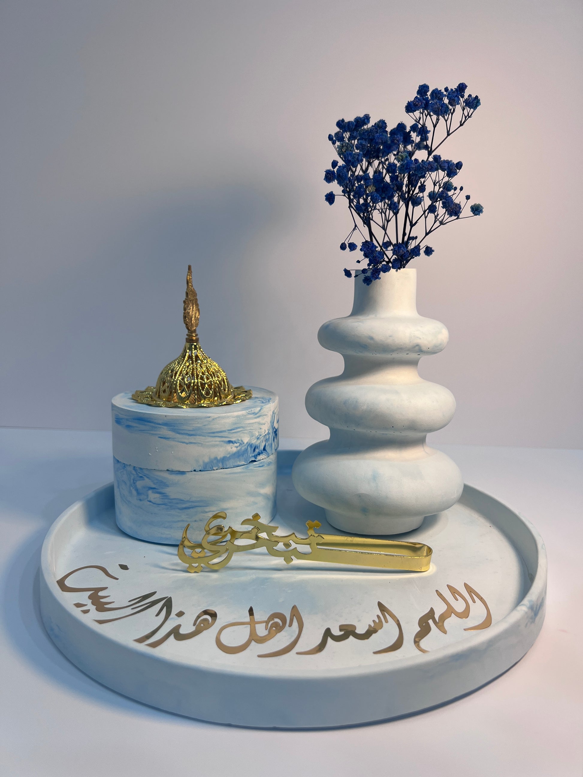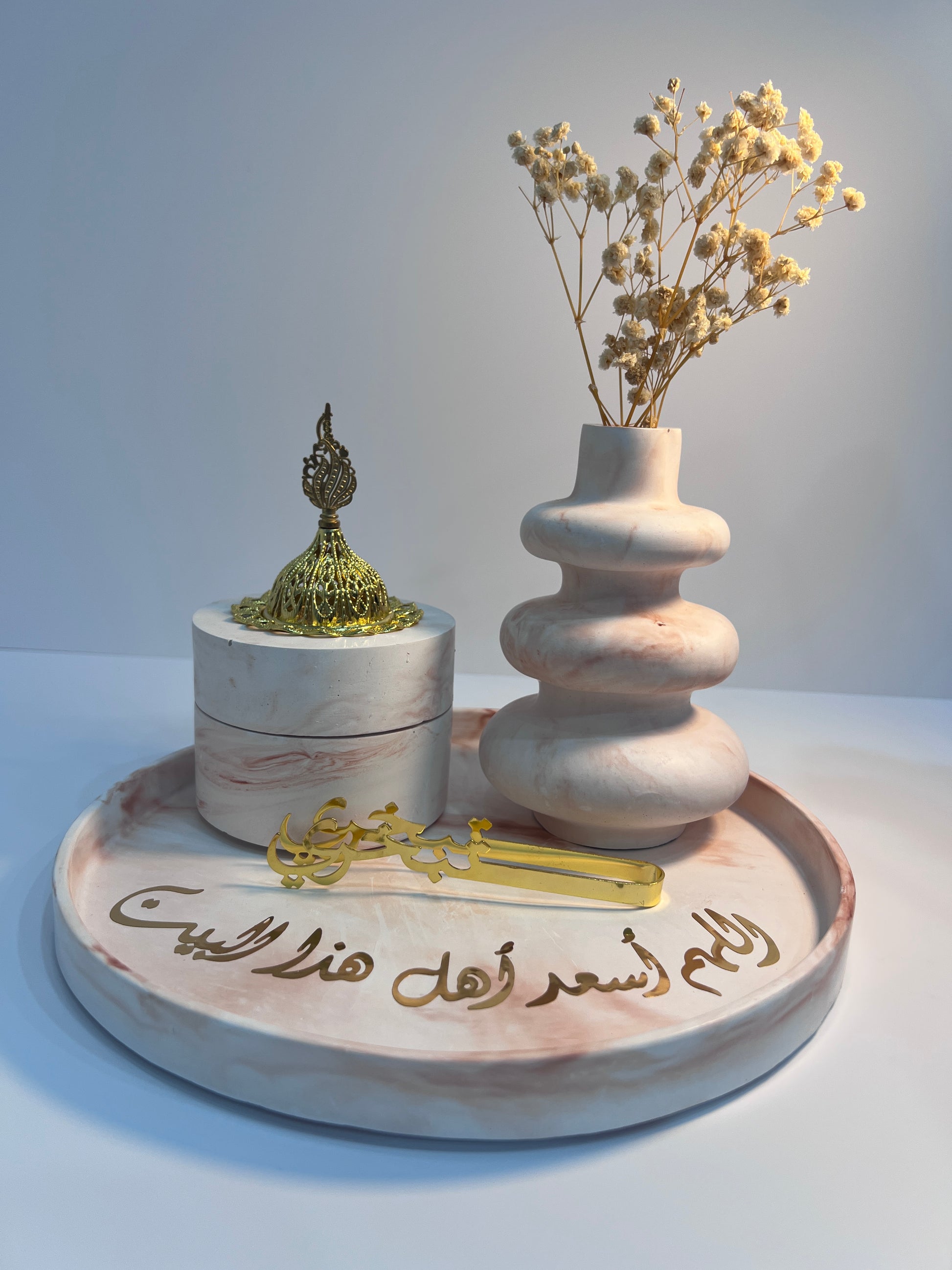 Le Pack est composé d'un plateau circulaire de 25*25cm ,vase de 10.2*15.2cm avec quelques fleurs séchées et un encensoir de 10*7.8cm avec un piqueتبخري pour parfumer votre espace